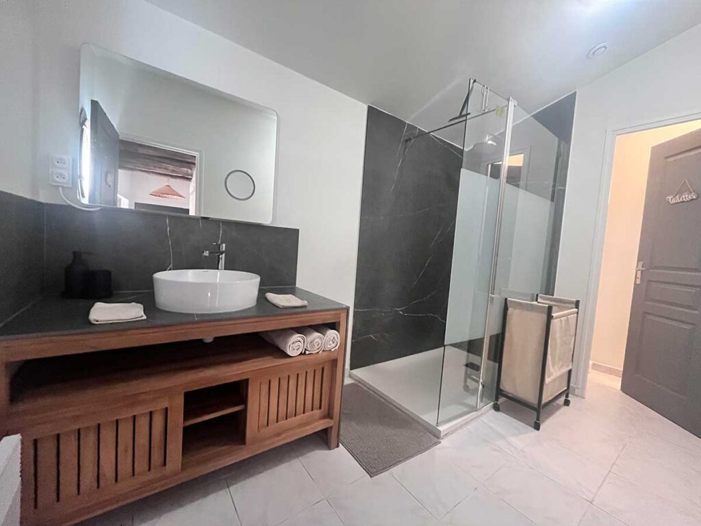 Le gite comprend deux chambres doubles et un canapé-lit de qualité (1m40) avec le linge de lit fourni, une salle de bain avec douche à l’italienne (serviette de bain et sèche-cheveux), une toilette privative, une cuisine équipée (taque au gaz, lave-vaisselle, vaisselle, frigo, hotte, micro-ondes, four, cafetière…), le wifi, la télévision, une terrasse privée et l’accès aux autres terrasses et, bien sur, à la piscine.
